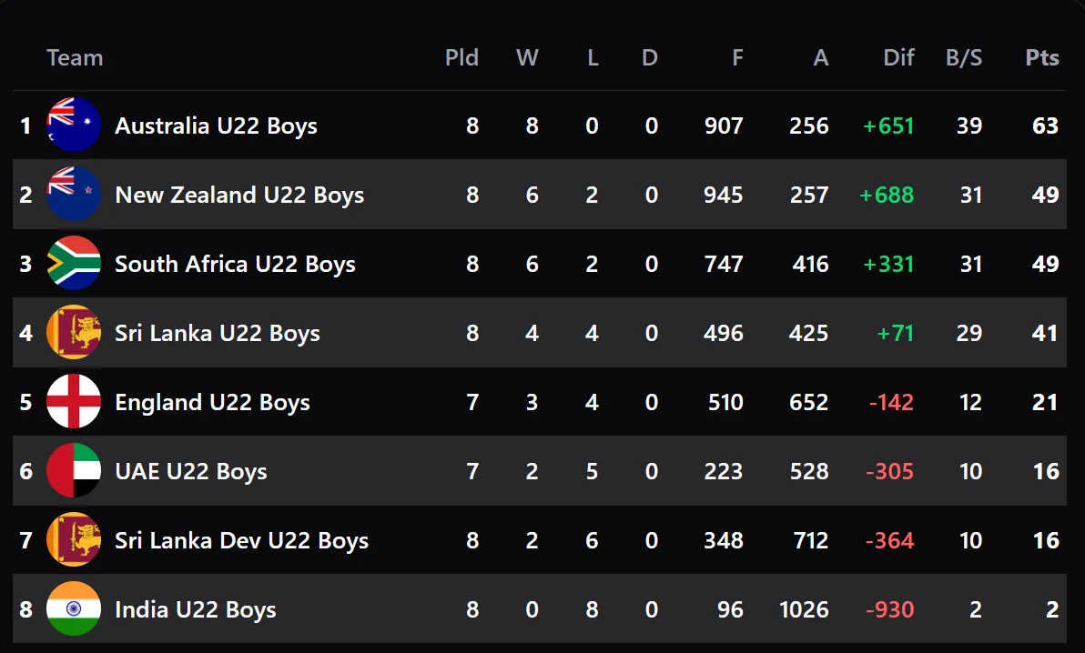 Reigning champions New Zealand will also feature in the Cup phase, after a mammoth win over Sri Lanka’s Development. Josh Young had a huge +48 game, while Charlie Pawson took four wickets.