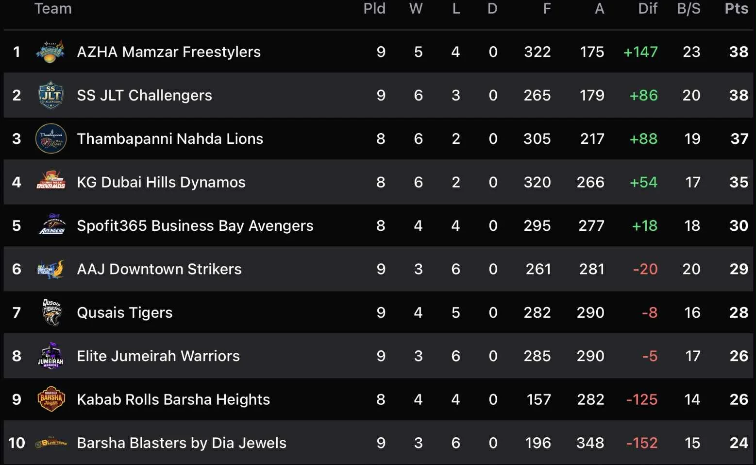 The Avengers are currently in fifth and should secure a qualifying spot (third to sixth) assuming they win at least one of their last two games, whilst the Strikers will need to win their final round-robin match to make the top six and keep the Tigers and Warriors out, whilst keeping alive their chances of defending their title. Kabab Rolls are five points back from them in ninth, but have an outside chance with a game in hand.